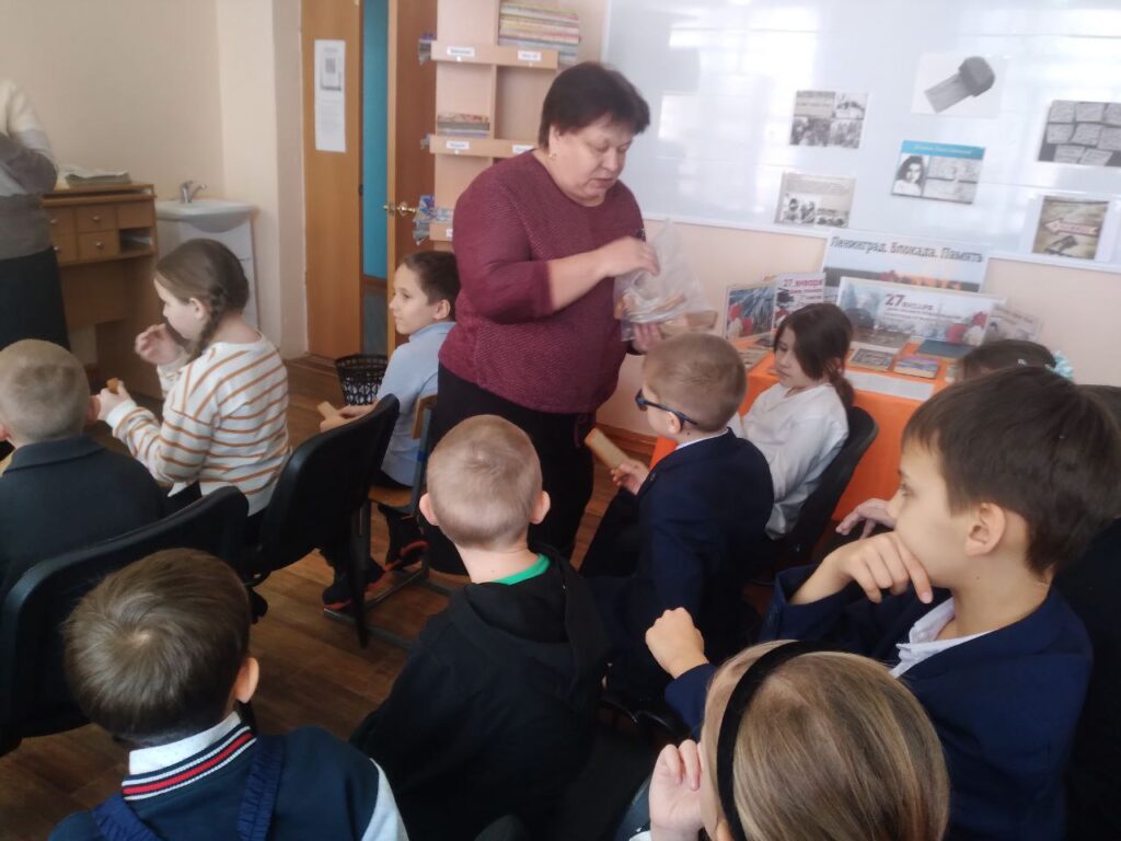Большое впечатление на слушателей произвёл рассказ о норме хлеба блокадников, о том, что значили в то время хлебные карточки. Чтобы дети воочию увидели норму суточного хлебного пайка, им раздали кусочки черного хлеба в 125 граммов, которые помещались на ладони.